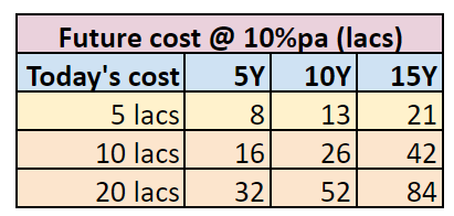 Illustration: 5 lacs of today's cost is estimated to be 8 lakhs after 5 years and can go up to 13 lakhs in the next 10 years. Similarly, a professional degree course that cost 20 lakhs today can go up to 52 lacs in the next 10 years.