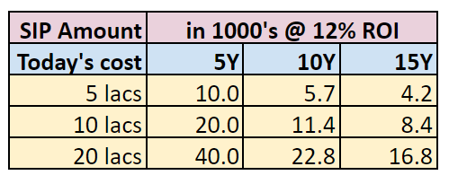 Now if we safely assume to earn @12% pa through a systematic savings plan for 5,10 and 15 years for varied education costs of 5, 10, and 20 lacs rupees (today’s price), we get the following matrix.
