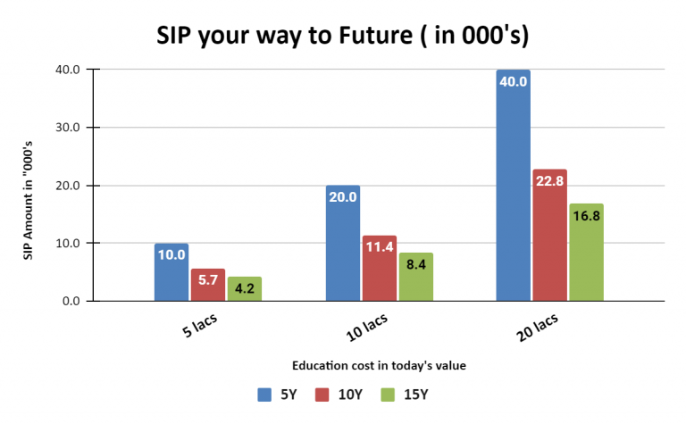 Illustration: For 5 lakhs of today's education cost which is estimated to be 8 lakhs after 5 years, the SIP you need to start today is approx 10K per month. Similarly, if a professional degree costs 20 lacs today, it will cost 52 lakhs in 10 years. This would require a SIP of 23K per month to achieve the goal.